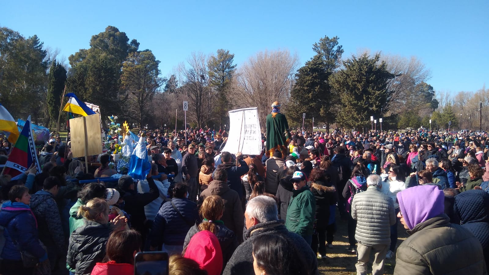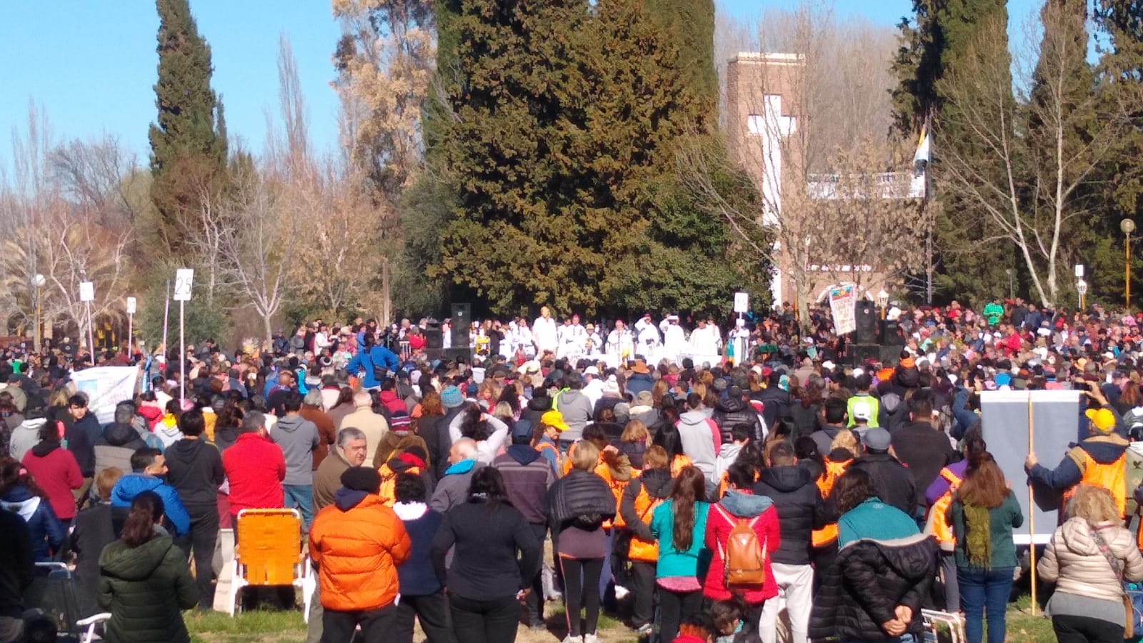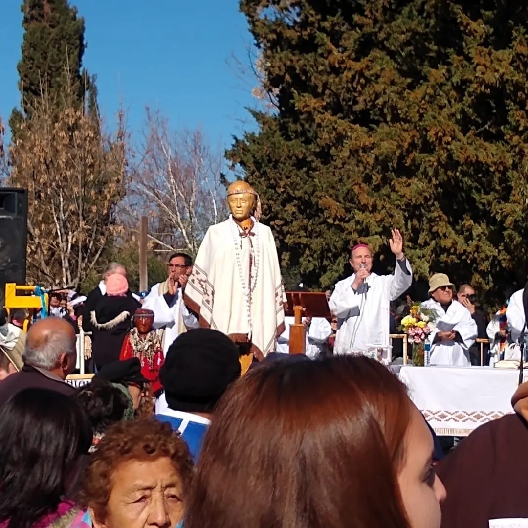 lo alto, sobre la visión peregrina, va al encuentro de la Virgen de Luján, patrona de la Parroquia de Chimpay, para presidir juntos la misa concelebrada por obispos y sacerdotes, allí al aire libre.