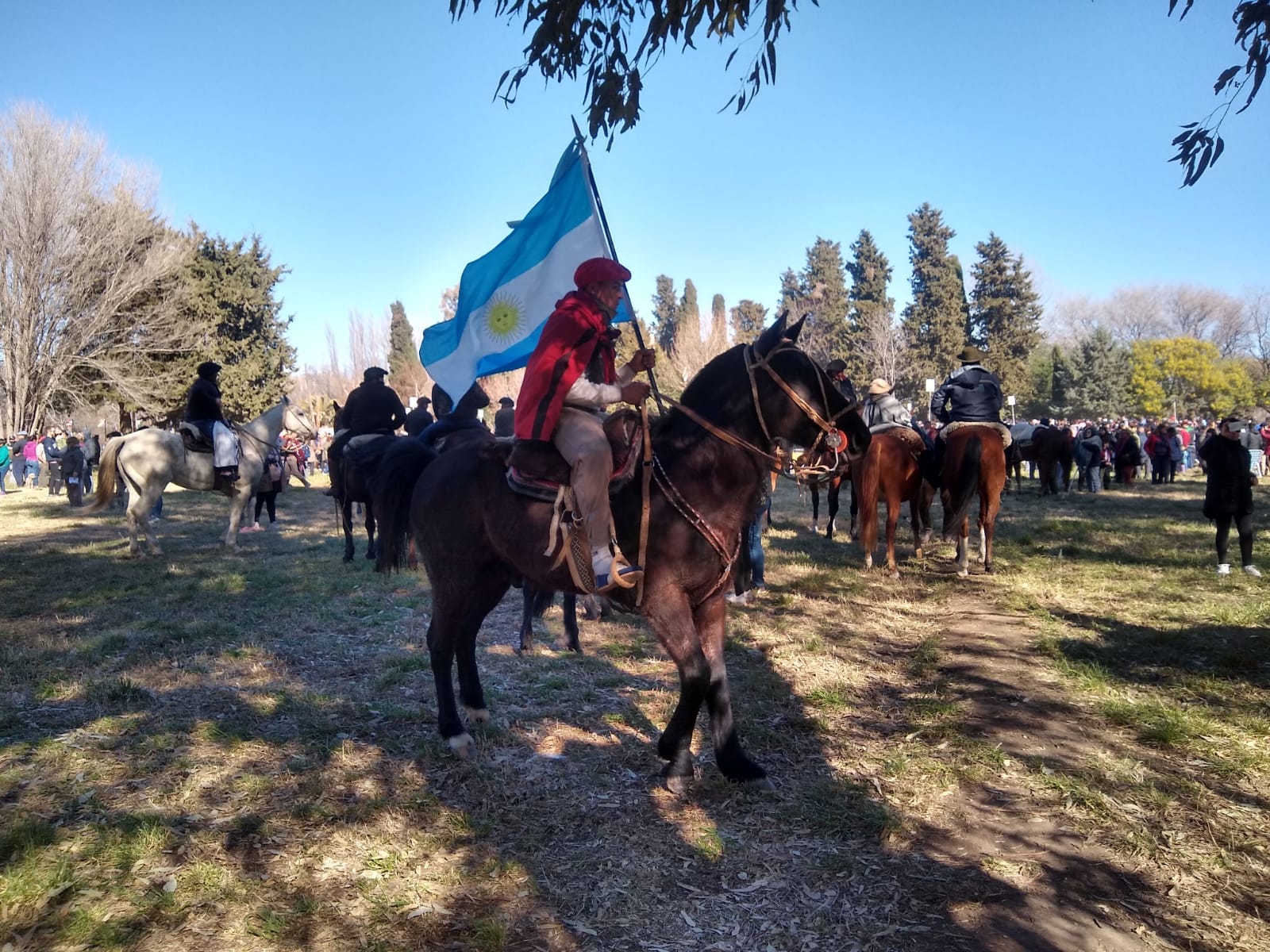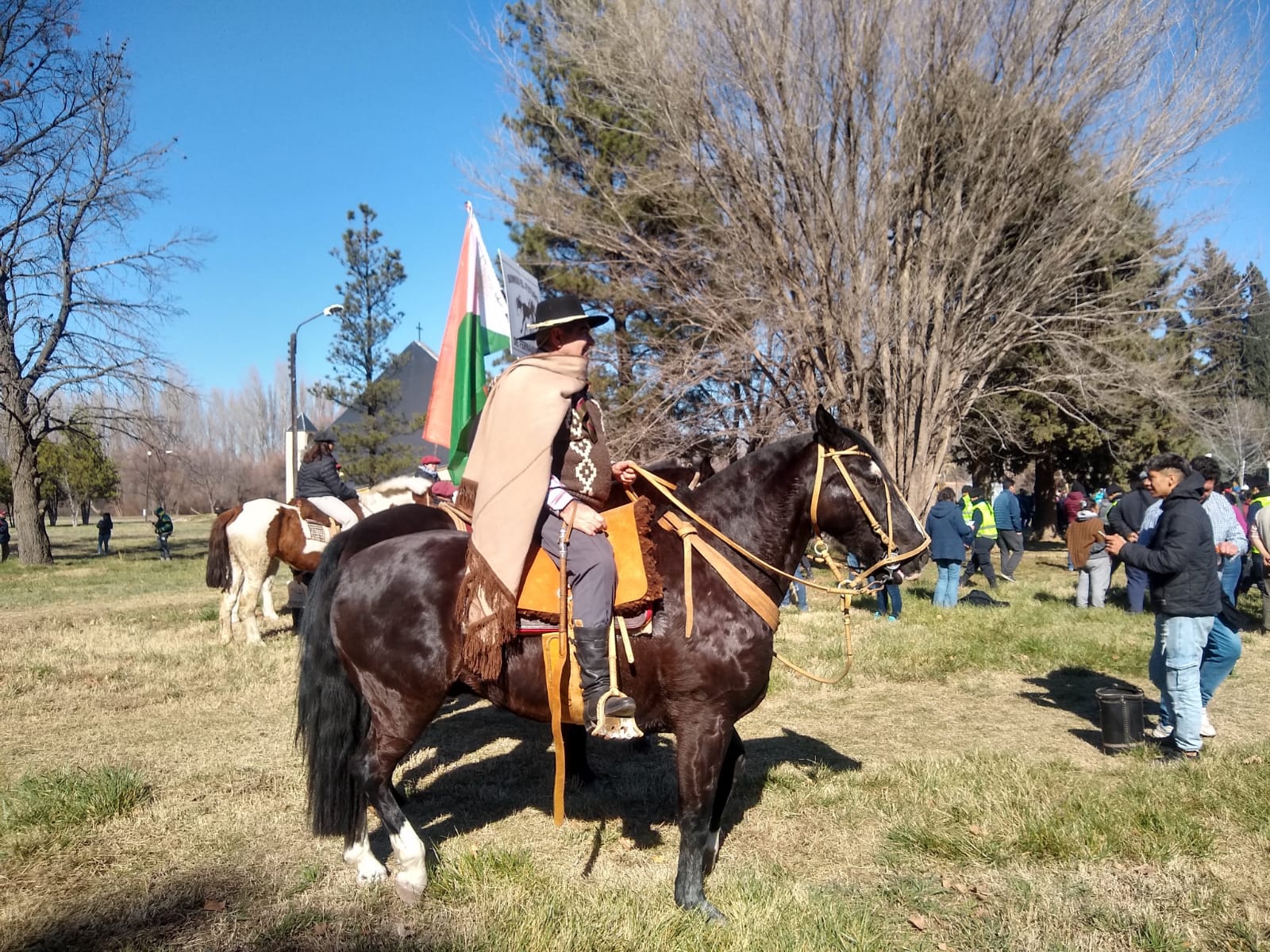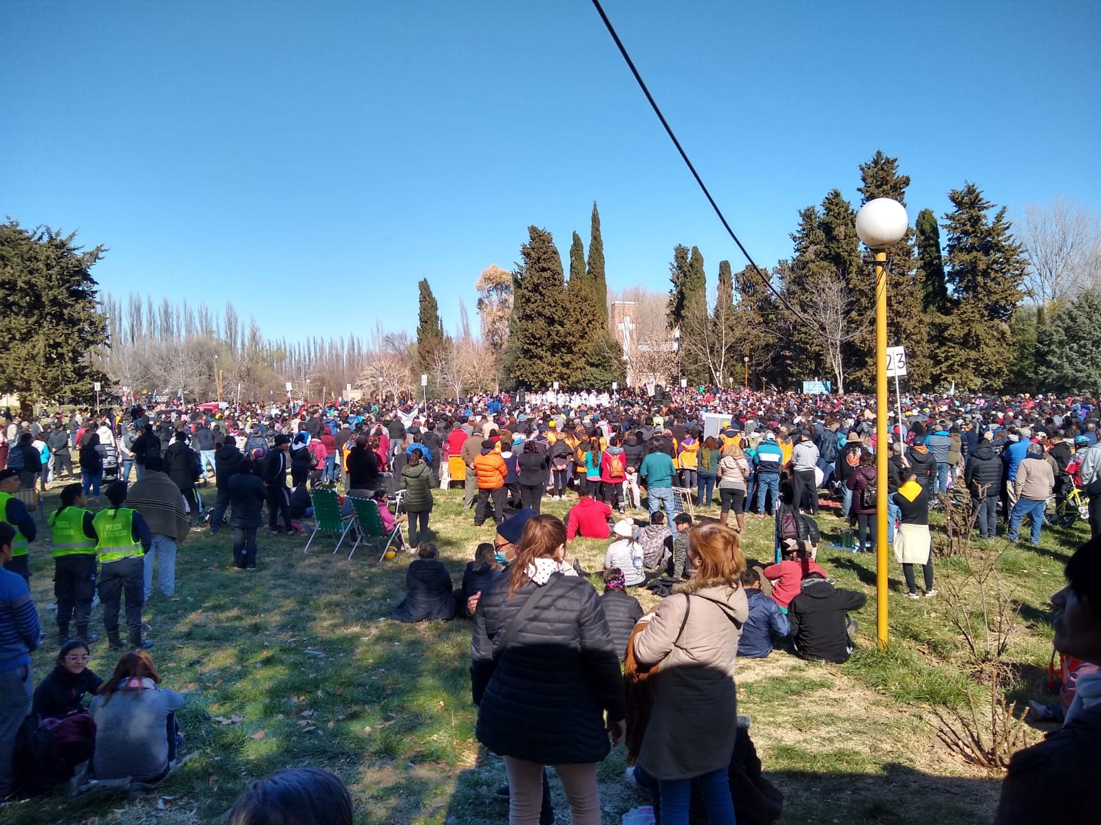 lo alto, sobre la visión peregrina, va al encuentro de la Virgen de Luján, patrona de la Parroquia de Chimpay, para presidir juntos la misa concelebrada por obispos y sacerdotes, allí al aire libre.